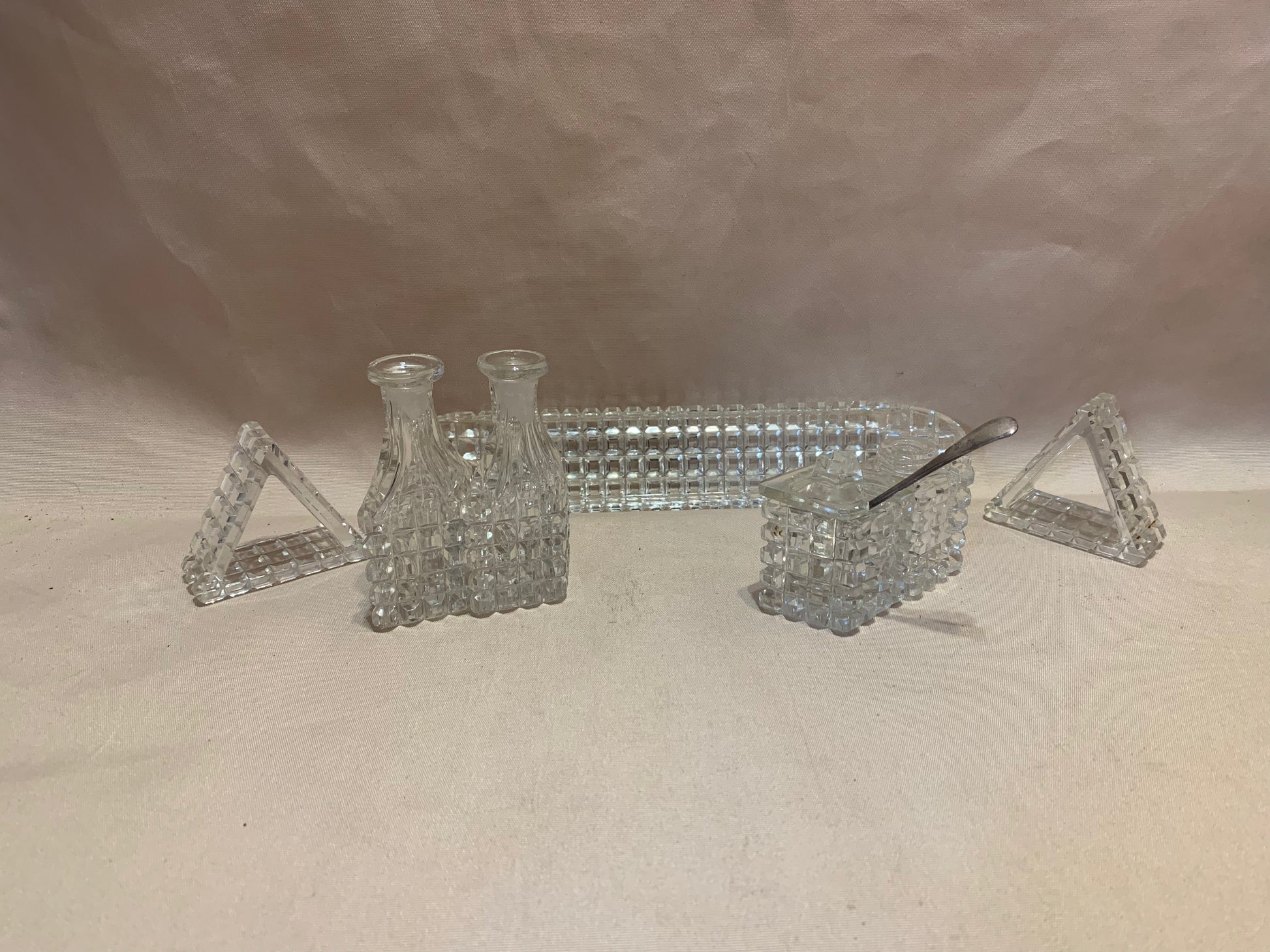Antique Lead Crystal Hand Cut 4 Condiment Cruet Set On Hand Cut Crystal Tray